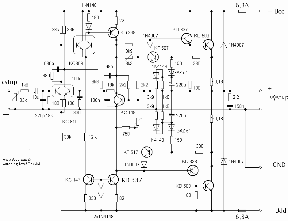 S týmto návodom bude spojený asi najchudobnejší technický popis, aký som kedy vyprodukoval. Schému tohoto zapojenia sa mi podarilo vymámiť z nemenovanej SOUE vo Vrábloch, kde sa na praxi prednostne venovali konštrukcii zosilňovačov. Kedysi dávno v živej červenej dobre rastu nf zosilňovačov v našej krajine tento typ zosíka navrhol súčastný učiteľ teoretických elektrotechnikcých predmetov na SOUE vo Vrábloch Ing. Jozef Trubíni . Na prvý pohlad sa jedná o pomerne zložitejšie zapojenie na tak výkonovo "priemerný" zosilňovač. O tom, že 100W stačí už na kadečo tu písať velmi nebudem, pretože dnešný svet je prepchatý zmagorenými ľuďmi "neotechnikmi" ktorí sú presvedčený, že zosíky pod 400W by sa ani nemali vyrábať. Ako som už spomenul, k tomtuto zosilňovaču nemám nijaké konkrétnejšie parametre ani dáta, iba snáď tie, ktoré som si doma zmeral a aj to boli tie najnevyhnutnejšie. A to som ani odoberaný prúd nemeral he, ale jednoduchými výpočtami sa dá odhadnúť, či šlape dobre alebo nie. V zapojení sú dva trimre, vstupný slúži v podstate ako potencioeter hlasitosti, je ho možné vynechať alebo zameniť za potenciometer. Druhý trimer slúži na nastavenie hodnoty kludového prúdu a to na hodnotu asi 60mA. Ďalej v zapojení nieje nič potrebné nastavovať, zapojenie pri dobrých súčiastkách funguje na prvé zapojenie a funguje dlho, aj krátkodobé skraty na výstupe znáša prekvapivo dobre. Zapojenie je prepchaté spätnými väzbami ktoré stabilizujú všetko, čo sa stabilizovať dá. Výsledkom týchto zložitostí je absolútne nulové napätie na výstupe pri nulovom budení. Ohrev koncovej dvojice pri vhodných chladičoch absolútne minimálny. Termistor v zapojení je pripojený do blízkosti koncového tranzistora pracujúceho v zápornej polvlne budiaceho napätia (záporná vetva). Nakolko je zapojenie dosť staré a náhrada uvedených typov tranzistorov by bola dosť ťažká a v antikvariátoch tranzistory nemávajú, predkladám náhrady uvedených typov tranzistorov za dnes bežne dostupné.