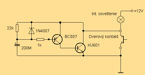 Je to veľmi jednoduché zapojenie časového spínača, ktorý dodáva do obvodu napätie ( nie konkrétne tento obvod, ale tento obvod ho len spína ) . Ak ste majiteľom staršieho auta, alebo ak si chcete doplniť vaše auto o oneskorené zhasnutie interiérového osvetlenia, je toto zapojenie vhodné práve tam. Súčiastky sú bežne dostupné, iba k tomu výkonovému tranzistoru snáď len toľko, že by mal byť aspoň na 30V a prúd 3A. Ja som volil typ „čo šuflík dal“ a bohvie či to nebol aj nejatý ruský hnoj ...Na kondenzátor v tomto obvode treba dbať najviac . Radšej by som doporučoval použiť nový, teda nie už vysušený, alebo niekde inde už použitý typ. (jeho kvalita bude mať na svedomí dobu svitu žiarovky). Celé zapojenie sa pripája paralelne k dverovému kontaktu dverí, podľa ktorých chceme mať osvetlenie ovládané, je možné pripojiť aj niekoľko kontaktov k jednému obvodu naraz, no je dôležité dodržať správnosť pripojenia + a -.